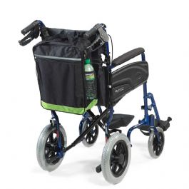 It has a large black material square that attaches to the back of the chair back and can be tightened with hook and loop strips. There is a loop on each side of the bag, enabling it to be attached to wheelchair push handles, and simply unclipped, removed and then easily attached again. There is a double handle, on top of the bag, a front pocket with one zip and a large pocket with two zips, each with pull tabs for ease of use and it has an elasticated net pocket on each side of the bag for small items to be easily accessed. There is a choice of reflective strips for added safety and visibility, along the front of the bag.